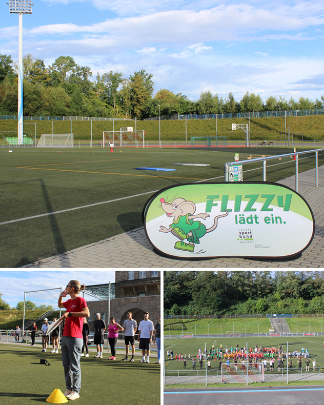 Ein besonderes Erlebnis war außerdem das FLIZZY-Kindersportabzeichen. An sieben Stationen – Standweitsprung, Zielwurf, Rumpfbeugen, Pendellauf, Balancieren, Rolle vorwärts und Hampelmann – konnten die Kinder ihre sportlichen Fähigkeiten unter Beweis stellen und sich über eine Urkunde und ein Abzeichen freuen. Natürlich durfte auch ein Gruppenfoto mit der FLIZZY-Maus nicht fehlen.